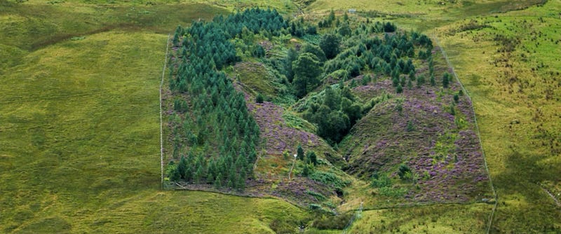The image above is from the film. It shows a small area of the highlands in Scotland. The contrast between the flourishing green forest in the middle and the surrounding green fields seems stark. You’d think a wide range of fertilisers and other tricks have been used to result in such big differences of vegetation.